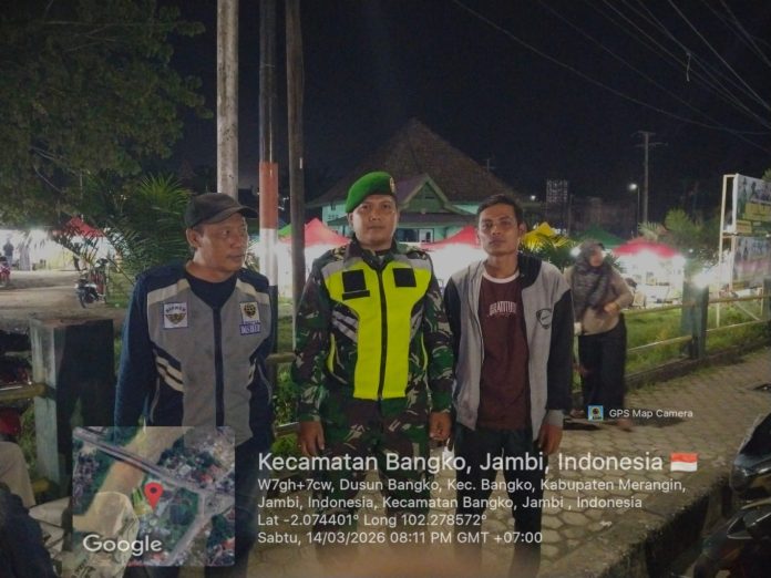 Redaksijambi.com (Merangin) – Menjelang Hari Raya Idul Fitri, Babinsa Koramil 420-09/Bangko meningkatkan kegiatan patroli malam sekaligus komunikasi sosial (Komsos) di wilayah binaan guna menjaga keamanan dan ketertiban masyarakat, Sabtu malam (14/03/2026).