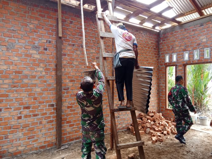 Tiga personel dari Koramil 09/Bangko bersama keluarga penerima bantuan serta masyarakat sekitar turun langsung bergotong royong. Kehadiran TNI di tengah masyarakat tak hanya membantu secara fisik, tetapi juga mempererat hubungan antara aparat dan warga.