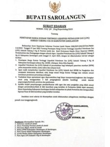 Surat edaran yang ditandatangani langsung oleh Bupati Sarolangun, H. Hurmin, SE, itu mengacu pada Surat Keputusan Gubernur Jambi Nomor 508/KEP.GUB/SETDA.PRKM-2.3/2022, serta hasil pertemuan Dinas Koperasi, UMKM, Perindustrian dan Perdagangan bersama seluruh agen LPG subsidi 3 Kg di Kabupaten Sarolangun pada 21 April 2025.