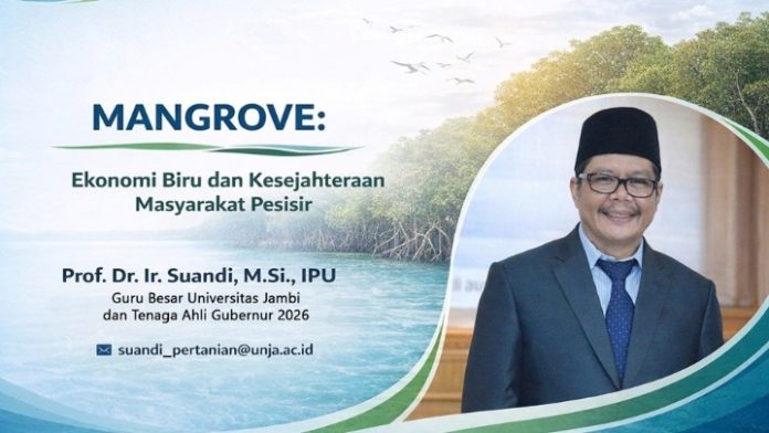 Redaksijambi.com.,- Meskipun terlihat sederhana, mangrove memiliki peran yang sangat penting bagi lingkungan dan kehidupan manusia, khususnya masyarakat pesisir. Mangrove berfungsi sebagai pelindung alami pantai dari abrasi, gelombang besar, bahkan tsunami. Selain itu, mangrove menjadi habitat berbagai jenis ikan, udang, dan kepiting. Keunikan mangrove terletak pada kemampuannya bertahan di lingkungan yang ekstrem, seperti air asin, tanah berlumpur, dan kondisi pasang surut yang terus berubah. Akar mangrove yang kuat dan kompleks membuatnya mampu menahan tanah agar tidak mudah terkikis. Oleh karena itu, mangrove sering disebut sebagai “benteng alami” wilayah pesisir. Di sisi lain, mangrove memiliki peran penting dalam mengurangi dampak perubahan iklim. Mangrove mampu menyerap dan menyimpan karbon dalam jumlah besar, bahkan lebih tinggi dibandingkan hutan daratan. Hal tersebut menjadikan mangrove bagian penting dalam konsep Ekonomi Biru, yaitu pembangunan ekonomi yang tetap menjaga kelestarian lingkungan laut dan pesisir.