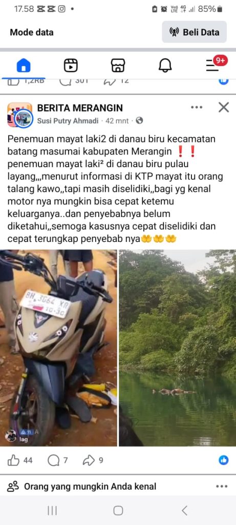 Berdasarkan informasi yang beredar di media sosial, identitas jenazah diketahui merupakan warga Lingkungan Talang Kawo, Kelurahan Dusun Bangko, yang mengarah pada data KTP korban.
