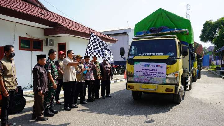 redaksijambi.com..merangin,- Bupati Merangin, M. Syukur melepas secara langsung keberangkatan bantuan pangan dalam Penyaluran Cadangan Beras Pemerintah tahun 2026 di halaman kantor Bulog Sarko, Kamis (12/03).