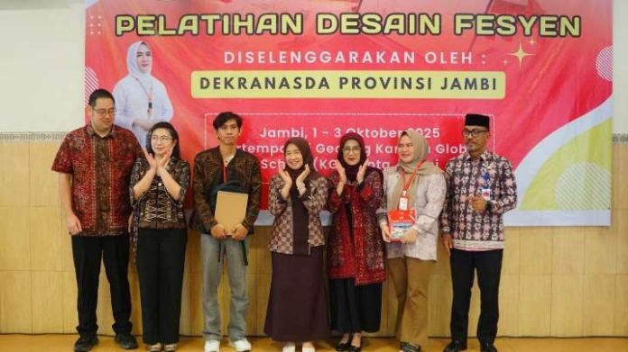 Redaksijambi.com.Jambi,  – Ketua Dewan Kerajinan Nasional Daerah (Dekranasda) Provinsi Jambi, Hj. Hesnidar Haris, SE, (Hesti Haris) menghadiri sekaligus membuka Pelatihan Desain Fesyen yang diselenggarakan oleh Dekranasda Provinsi Jambi di Gedung Karunia Global School, Kota Jambi, Rabu (01/10/2025) pagi.